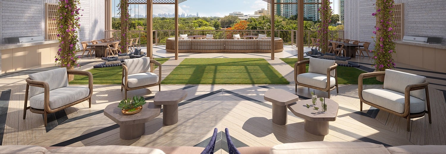 Rooftop lounge with summer kitchen, grills, and dining spaces