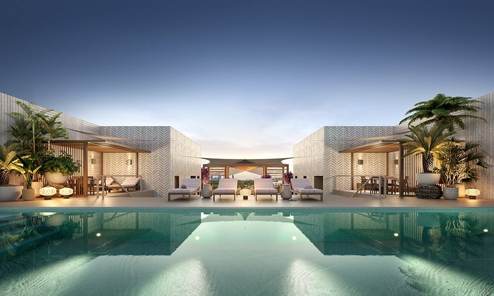 Heated 40‑ft rooftop lap pool with private cabanas & observation deck