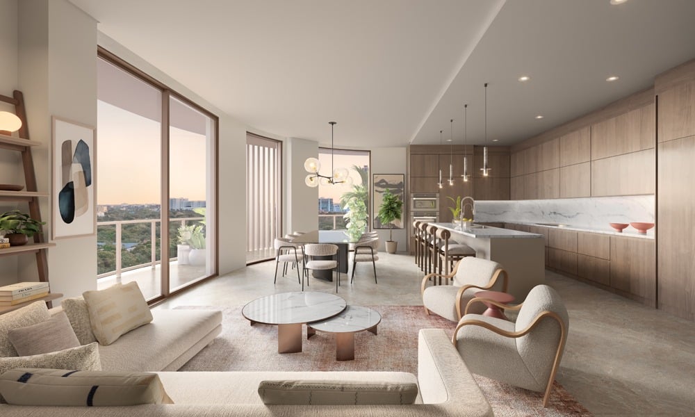 Each residence at The Lincoln features an artfully designed den or office, high ceilings (up to 11 ft), oversized balconies, and first‑in‑class finishes—Italian Snaidero kitchens, Miele appliances, Porcelanosa tiles, marble primary baths, and smart‑home readiness—all wrapped in an eco‑certified, boutique envelope.